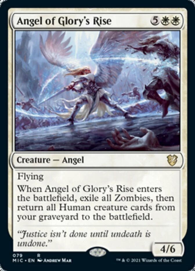 When Angel of Glory’s Rise enters the battlefield, exile all Zombies, then return all Human creature cards from your graveyard to the battlefield.