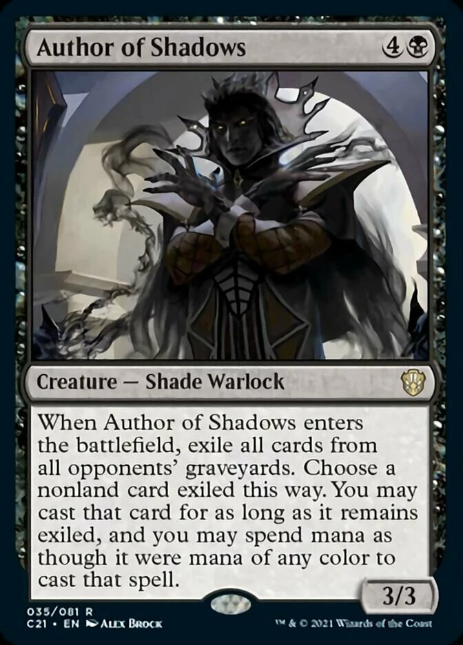 When Author of Shadows enters the battlefield, exile all opponents’ graveyards. Choose a nonland card exiled this way. You may cast that card for as long as it remains exiled, and you may spend mana as though it were mana of any color to cast that spell.