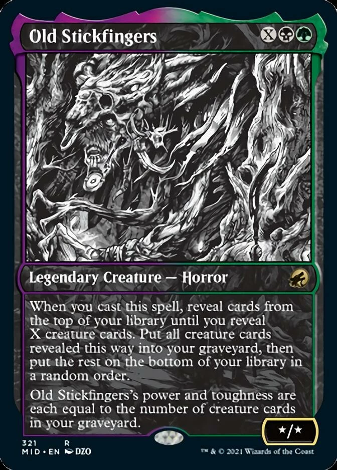 Old Stickfingers’s power and toughness are each equal to the number of creature cards in your graveyard.